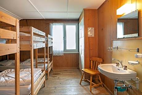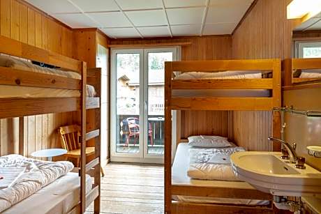 In our LAKE LODGE, a classic Swiss chalet right on Lake Brienz, we offer affordable accommodations in a total of 20 family-friendly twin, double, four-bed, or six-bed rooms. In addition to the rooms in the hostel, the Spatz apartment can be booked from mid-May to September. The apartment is located in a rustic chalet building behind the lodge and is perfect for families with up to 6 people. The hostel rooms share a communal bathroom on each floor. Each room has a sink and mirror. A washing machine and dryer can be used free of charge. WiFi is available throughout the house at no cost. In the common area, you will find a refrigerator, microwave, and coffee/tea station. No cooking facilities! Around the house, you can make yourselves comfortable in lounge furniture. Dogs are welcome at our Lake Lodge.