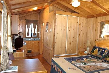 Featuring a wood fire pit and barbecue facilities, this cottage provides lighting, a ceiling fan and electric heat. Access to shared bathroom and showers is offered. Bathroom is located about 35 feet away from the cottage. Fire wood and bath towels are provided for a fee at reception.