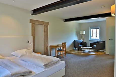 The charming Landidyll Hotel with its extensive gardens is a wonderful backdrop for celebrations, seminars and events of all kinds, also due to its different and unusual rooms. You can relax here! Small getaways can easily be booked. Various wellness, pleasure or hiking packages are available. The 28 comfortable rooms, furnished with great attention to detail, are available in the Classic, Comfort and Premium categories. The sauna and a relaxation room are located in the rustic sandstone vaults of the old mill. In addition to the hotel, Erik Jennewein continues to run the farm and his sister Carla, together with her wife Catie, supplies fresh herbs and vegetables for the restaurant kitchen from their own farm "Fräulein Lenz". The restaurant is extremely popular with both hotel guests and the regional public and was recently recommended in the Palatinate Restaurant Guide. Dogs are welcome in our dining rooms Erika and Peter, as well as on our terrace. We ask for your understanding that pets are not allowed in the restaurant.
