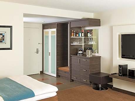 This room has an open bathroom with central tub or a large tropical jet shower, flat-screen TV, a mini bar and Nespresso® machine.