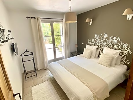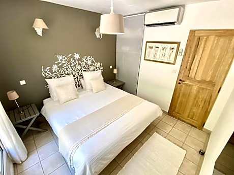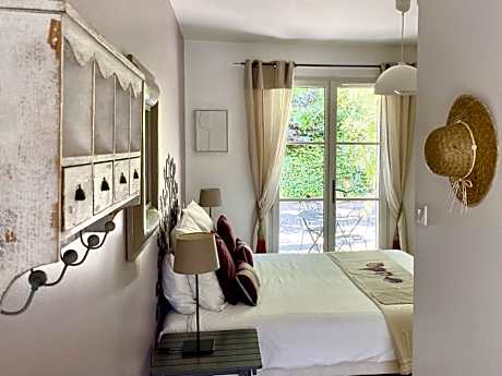 Le Jardin de Lau offers you a pleasant stay in the FIGUIER room. This comfortable 66 ft² room is designed to accommodate up to 2 people. You will have a large double bed (71 in x 79 in, 2x90, divisible beds, to be specified when booking), a fully-equipped kitchenette (fridge, microwave, hob, coffee machine, etc.), a charming shower room with a large walk-in shower and wall-hung WC. There are also two private furnished terraces. The first is covered and faces the swimming pool. The second, on the garden side, benefits from the coolness of the Carpentras canal bordering the property and allows you to use an electric griddle at your leisure. The bedroom has a flat-screen TV with TNT channels and free Wi-Fi access. Independent entrance. Free secure parking on site. Please note that the end-of-stay cleaning fee of EUR 55 is not included in the rate.