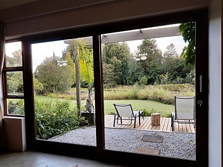 This air-conditioned room has a 11 foot wide sliding doors to a private patio and views of the lily ponds. This room is equipped with an honesty bar, fridge and tea & coffee making facilities. A CD/Ipod docking station is available. The open plan bathroom is fitted with an oval bath, walk-in rain shower, double basins, towel heater, hair dryer, robes and room safe.