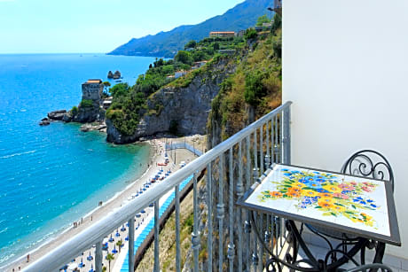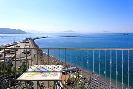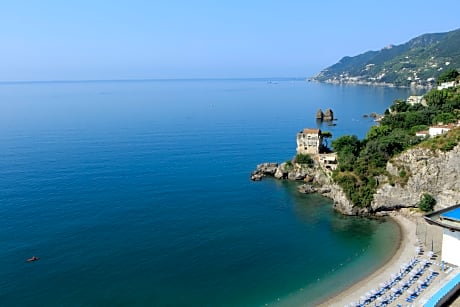 In a quiet location at the south end of the Amalfi coast, Lloyd's Baia Hotel has a panoramic cliff-top setting above its private beach. In Vietri Sul Mare, it is a 10-minute drive from Salerno harbor. Offering beautiful views out over the Mediterranean Sea, Lloyd's Baia is ideal for driving up the Amalfi Coast. The town of Amalfi is just 20 minutes away by car. Guests can relax on the hotel's terraces and down at the beach, which is reached by a glass lift and where you have discounts on lounge chairs, towels, and sun umbrellas. Every weekend during summer, staff organize a special evening of entertainment under the stars at the beach. Breakfast is buffet style and includes lots of fresh fruit. The restaurant serves specialties from the Campania region for lunch and dinner. You can enjoy drinks in the lounge bar or out on the terrace. Rooms are spacious and comfortable. All air-conditioned, they feature a laptop-size safe, minibar and an LCD TV with satellite channels. Each one has a private bathroom with a hairdryer and toiletries.