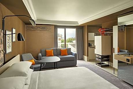 The hotel features a large swimming pool, ideal for relaxation and exercise. Each spacious room is equipped with Apple TV, pay movies, and air conditioning. Many rooms also offer a balcony. Guests can choose from rooms with one king bed, two double beds, or larger rooms with a living area for added comfort.