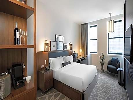 Guests are invited to experience comfort and convenience with a twist of architectural marvel. Each spacious guest room is thoughtfully designed, combining modern amenities with awe-inspiring views of the Chicago skyline and historic landmarks. With a keen eye for detail, the accommodations ensure a memorable stay, complete with a 55-inch flat-screen TV and a large workstation, all complemented by complimentary WiFi.