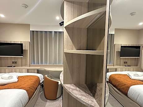 All Double rooms have standard size 4'6 double bed, private bathroom, free Wi-Fi and tea/coffee making facilities.There are no twin beds available at the hotel.
