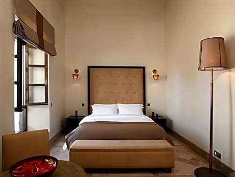 Decorated in pale red ocher with fabrics in warm sabra colors, club armchairs and torch lamps. The bathroom opens into the bedroom.