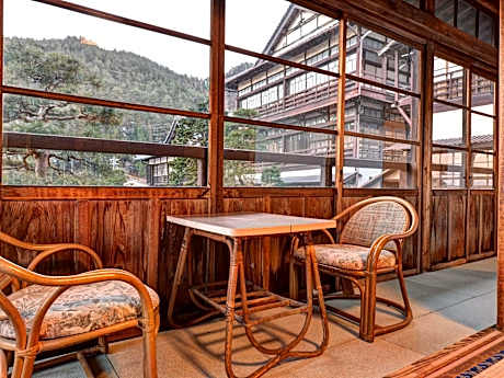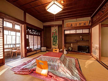 This quadruple room's special feature is the private open-air bath. The quadruple room features a shared bathroom, tatami, a tea and coffee maker, as well as a seating area with a flat-screen TV. This quadruple room has yukata, heating and a TV. The unit offers 4 futons.