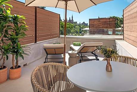 Located next to Plaza España in central Seville, Hotel Meliá Sevilla features impressive avant-garde design. It offers a seasonal outdoor pool and plasma TV. The stylish rooms at Hotel Meliá Sevilla have trendy, modern design and lots of natural light. All rooms come with international satellite TV channels and the bathroom features TV speakers. The hotel also dedicates some of its areas to The Level exclusive rooms and services, where The Level guests have private access to The Level Lounge with open bar and private buffet, daily cocktails, press and concierge services and pre-arrival services. Rooms include superior amenities and toiletries, children amenities, iron services, sound bar, flat-screen TV with satellite channels, Nespresso coffee machine and fragrances menu, among other services. The hotel’s Mosaico restaurant serves an international buffet breakfast. Guests can also enjoy à la carte international food for lunch or dinner at Quimera Restaurant. The Meliá is next to María Luisa Park, and you can walk to Seville Cathedral and the Alcázar in around 15 minutes. During Seville Fair, the hotel organizes transfers from the property to the festivities area.