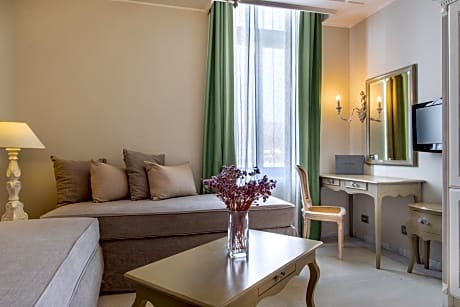 Elegant and spacious suite tiled with stone. Features a seating area with 2 sofa beds. Features a bathroom with bathtub and WC. Has a private garden.