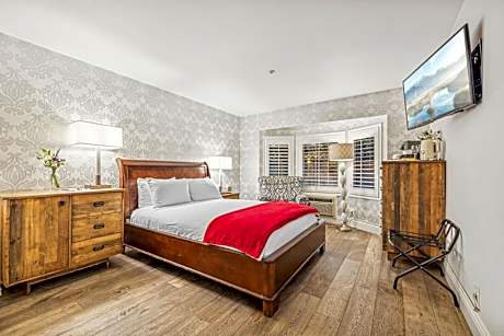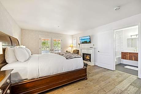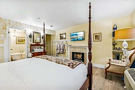 Located on the second floor, this room is elevator accessible and designed with a fireplace and wood flooring. Upgraded bedding, antiques and a 40-inch flat-screen TV are featured in this room.
