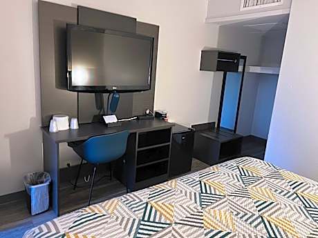 Cable TV and a work desk are featured in this room.