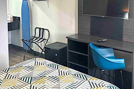 This room features a flat-screen TV with cable channels. A work desk is provided.