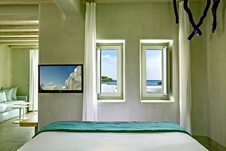 Located on the sandy and lively Ornos Beach, the 5-star boutique hotel of Mykonos Ammos provides trendy sun loungers and beach service. Member of the Small Luxury Hotels of the World, it features an outdoor pool, and a wellness and beauty center. Free Wi-Fi is available throughout. Stylishly decorated with earth tones and white washed walls, the spacious rooms and suites are air conditioned. Each comes with a 37” flat-screen TV, DVD player, laptop safe, toiletries and hairdryer. They all open out to a terrace or balcony, while some offer sea views. Kuzina Restaurant provides fusion culinary dishes that combine Asian and Mediterranean flavors and can be enjoyed by the seaside. Farina Italian Restaurant serves genuine Italian cuisine in a stylish setting, while Mykonos Ammos Beach and Bar prepares signature cocktails throughout the day. Room service is also accessible. Guests are provided with complimentary beach towels and daily newspapers. The 24-hour front desk can arrange tours of Mykonos and concierge services upon request with surcharge. Mykonos Ammos Hotel is just 1.6 mi from Mykonos Town, as well as Mykonos Airport and the port. Various restaurants, cafés and a supermarket are all within a short walking distance. Private parking can be found on site.
