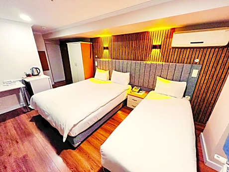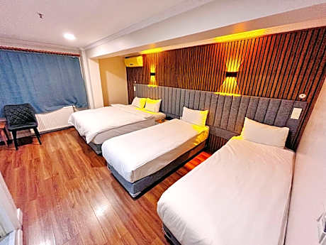 Featuring free toiletries, this quadruple room includes a private bathroom with a shower, a hairdryer and slippers. The air-conditioned quadruple room features a flat-screen TV with cable channels, a private entrance, soundproof walls, a wardrobe as well as city views.