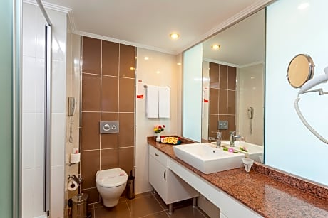 Located 1640 feet from its designated area on the beach, this resort features an outdoor pool, indoor pool and waterslides. Free shuttle service to beach area is also offered every 20 minutes. There is a spa and wellness center and free Wi-Fi in public areas. Air-conditioned rooms at Narcia Resort Side offer an LCD TV with satellite channels, mini-bar and a balcony with views. Bathroom includes a shower, free toiletries and a hairdryer. Nar Restaurant serves a wide range of dishes from all around the world in buffet style. Lalezar À La Carte Restaurant offers Ottoman Cuisine specialties. Bar is ideal for refreshing drinks. Guests can work out in the fitness center and relax in the Turkish bath, sauna or massage rooms. A playground, children’s pool and a games room are available on site. Side town center, with an ancient amphitheater and the temple of Apollo, is a 10-minute drive away. Antalya Airport is 40 mi from Narcia Resort Side. Free private parking is possible.