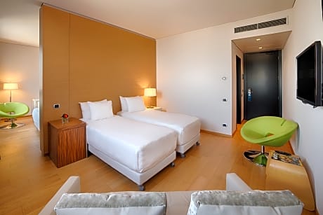 The dramatic towers of NH Milano Fiera are located next to Rho Fiera Milano Exhibition Center. This stylish, modern hotel offers spacious design rooms and free WiFi throughout. Each room includes elegant parquet floors, an LCD TV with satellite channels, and a mini-bar. Some rooms provide extra space and a tea/coffee maker. Open for lunch and dinner, NHube restaurant specializes in Italian cuisine. NH Milano Fiera is a 10-minute walk from the Rho Fiera Metro Stop, with trains to Milan city center. Milan Malpensa Airport is 30 minutes' drive away, while Arese Shopping Center is a 10-minute drive away. A charge of EUR €25 per pet per night will be applied (max of 2 pets per room).