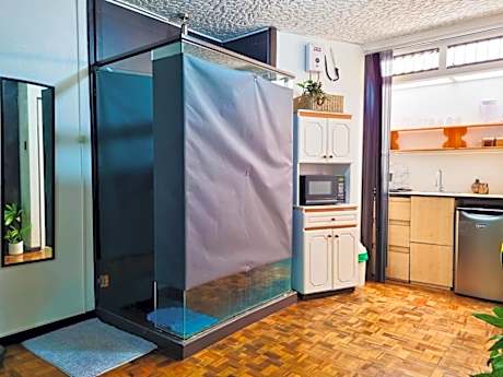 Great care is taken to ensure guests experience comfort through top-notch services and amenities. Stay connected with your associates, as complimentary Wi-Fi is available during your entire visit. When arriving by car, take advantage of the serviced apartment's convenient on-site parking facilities. Whether you're here for an extended stay or simply require fresh garments, the serviced apartment ensures your cherished travel attire remains spotless and accessible with the convenience of laundry service located on the premises. In order to ensure the utmost level of relaxation, the guestrooms feature an inviting design and are equipped with all basic necessities, creating a delightful stay experience.To ensure a pleasant stay, a selection of rooms at serviced apartment come furnished with linen service and blackout curtains, all designed with your ease in mind. Several chosen accommodations at 714 Studios have a balcony or terrace incorporated into the room design.In select rooms, visitors can enjoy a touch of amusement with the availability of television and cable TV for their entertainment needs.Within specific rooms, a refrigerator and a coffee or tea maker is conveniently available for your use. Understanding the significance of bathroom facilities in enhancing visitor contentment, serviced apartment offers a hair dryer and toiletries within a few chosen chambers. Throughout the day, engage in the entertaining activities available at 714 Studios. Guests who enjoy maintaining their fitness regimen while on holiday can visit the fitness center provided by serviced apartment.