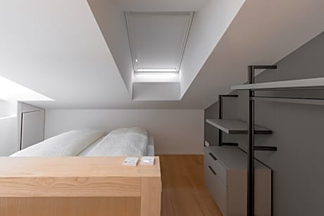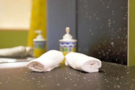 Room with attached bathroom with a TV. Some rooms have a balcony.