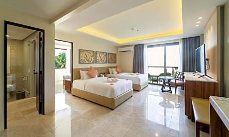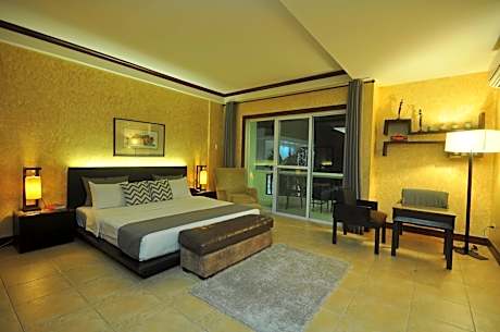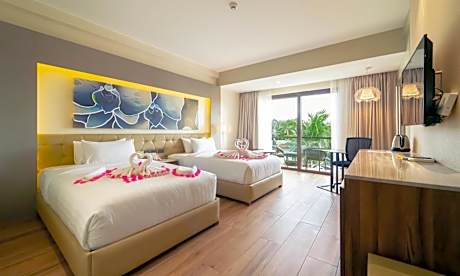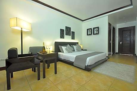 This room has a balcony that opens up directly to the pool area. It includes a seating area, flat-screen cable TV and an private bathroom.