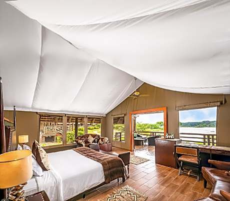 Chobe Safari Lodge-East Africa Uganda is located within the Murchison Falls National Park and offers panoramic views of the Nile River. The lodge has a three-tiered outdoor pool and is located a 20-minute drive from Karuma Falls. Chobe Safari Lodge-East Africa Uganda has rooms within the main building, tented accommodations, a bungalow and private cottage. Most of its accommodations enjoys views of the river and each has ceiling fans, TV and a private bathroom. Towels and bed linen are provided. Local and international cuisine is served at the restaurant and drinks can be enjoyed at the bar. Chobe Safari Lodge-East Africa Uganda also offers massage treatments and includes a spa center, sauna, and fitness center. There is a business center and conference facilities. African crafts and souvenirs can be bought at the gift shop. Activities offered at Chobe Safari Lodge-East Africa Uganda inlcude safari drives, nature walks, bird watching, shore fishing. The lodge can organize bush breakfasts, day trips to Murchison Falls or Ziwa Rhino Sanctuary.
