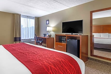 This Comfort Inn is located in Matthews in the Windsor Square Shopping Center. Free WiFi is offered throughout the hotel. Complimentary tea and coffee are available in the lobby, and the free hot daily breakfast includes eggs, meat, yogurt, fruit, cereal, and waffles. All guest rooms are equipped with a 32-inch flat-screen cable TV, desk, refrigerator, microwave, and coffee machine. Each private bathroom has a curved shower rod and hairdryer. Connecting rooms can be requested. This nonsmoking hotel features a seasonal outdoor pool, fitness room, and business center. There are also 2 banquet and meeting rooms. For added convenience, coin-operated laundry facilities are located on site. Parking that can accommodate trucks and busses is available. The hotel is near Discovery Place, Bank of America Stadium, Bojangles Coliseum, Verizon Wireless Amphitheater Charlotte, and Carowinds amusement park. Additional points of interest close by include: Extreme Ice Center, Carolina Courts, Lowe's Motor Speedway, University of North Carolina at Charlotte, and Time Warner Cable Arena.