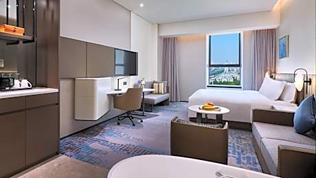 Experience an abundance of unparalleled facilities and features at Crowne Plaza Wuhan Development Zone By IHG.Share your photos and respond to emails at your convenience, thanks to the free Wi-Fi internet access offered by hotel.Taxi and car hire offerings at the hotel simplify arranging your excursions, explorations, and additional activities in Wuhan. Visitors can take advantage of complimentary parking directly at the hotel. Reception services such as concierge service, express check-in or check-out, luggage storage and safety deposit boxes are available to accommodate your requirements.Traveling with minimal baggage is achievable at Crowne Plaza Wuhan Development Zone By IHG, as the hotel's dry cleaning service and laundry service ensures your garments stay fresh.Room amenities like room service and daily housekeeping contribute to making a perfect selection for your stay.The hotel maintains a completely smoke-free zone, providing a breathable atmosphere. Smoking is limited to specified smoking zones.Each accommodation at Crowne Plaza Wuhan Development Zone By IHG is thoughtfully created and adorned to provide visitors with a comfortable, home-like atmosphere. In certain rooms, the hotel offers linen service and air conditioning for guest convenience and satisfaction.In select rooms, guests can enjoy a touch of amusement with the availability of television for their entertainment.Rest assured, in a few chosen rooms, the presence of mini bar can be found.Maintain your cleanliness and comfort using a hair dryer, toiletries and bathrobes available in select guest restrooms.Immerse yourself in the executive lounge, where exceptional amenities and lavish surroundings await you. Embark on your holiday experience in the most ideal manner. Commence each morning of your visit with an on-site breakfast.Should you prefer not to venture out for a meal, the enticing culinary choices at hotel are always available for your satisfaction.Should you be particularly discerning in your dining choices, you will surely appreciate having access to the on-site BBQ facilities provided at this location. Indulge in the numerous pursuits available at Crowne Plaza Wuhan Development Zone By IHG.Unwind after your day by exploring the sauna and find warmth and relaxation. Each day at hotel, immerse yourself in the invigorating waters of the pool, perfect for a rejuvenating plunge or a series of revitalizing laps.For individuals who don't want to skip their exercise routine, visiting the hotel fitness center ensures you maintain your vitality and wellness.