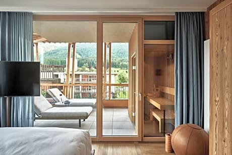 This spacious suite with a furnished balcony features a panoramic infrared cabin, mini-bar and tea/coffee station. Also has wall bars, fitness equipment and a medicine ball.
