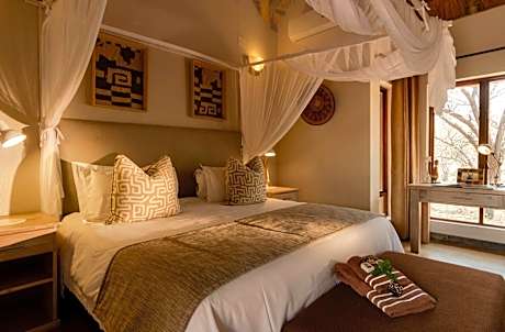 Giraffe Lodge is a 3-bedroom self-catering villa, located on Hoedspruit Wildilfe Estate. The property is surrounded by a private bush area of 4900 square yards and features a patio with splash pool. The thatched villa consists of of 2 floors and is decorated in neutral, earthy tones. On the ground floor it offers a spacious open plan living area with sofas, arm chairs and flat-screen TV. The adjoining kitchen is fitted with a dishwasher, microwave and stovetop. There is a dining table inside as well as outside under a pergola. There are 2 bedrooms with a king size bed and a bathroom with shower and bath. One of the two bedrooms features an private bathroom fitted with a shower. Upstairs there is a bedroom with 2 single beds and a balcony with view of the bush and mountains. A selection of activities are offered in the area, such as game drives, golfing and horse riding. Game drives and tours are offered, and meals can be provided with prior arrangement. Housekeeping is provided on weekdays.