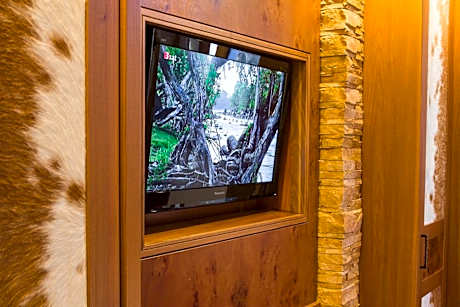 Room with attached bathroom with a flat-screen TV with satellite channels.
