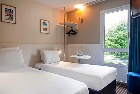This Hotel Hôtel Kyriad Dieppe is located 3.1 mi from the Dieppe city center and its historic fishing port. Meeting rooms are free private parking are available on-site. Decorated in a contemporary style, each room features free WiFi access, a flat-screen TV and a courtesy tray with tea and coffee making facilities. Each room also features a private bathroom with a shower. A buffet breakfast is served every morning. The Hotel Kyriad Dieppe is just 2.5 mi from Dieppe Train Station and guests can discover the beaches along the Norman coast and Caux region. Swimming pool access is available 16 feet from the hotel for a supplement of 10 euros per person.
