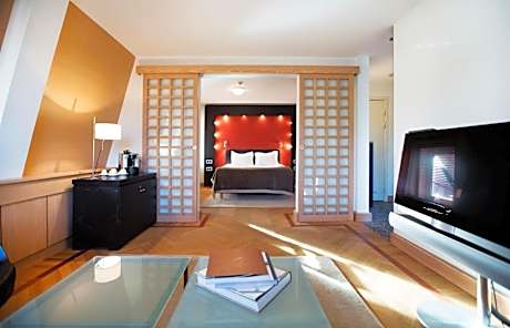 Offers an HD LED TV with Chromecast, a seating area and Japanese-inspired design.