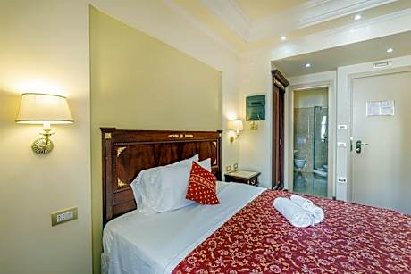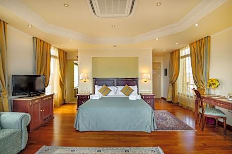 Room with attached bathroom with parquet floors and wooden furniture. Offers free Wi-Fi, a flat-screen TV with satellite channels, and air conditioning.