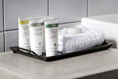 The bathroom includes luxurious products from Humdakin Clean Skincare.