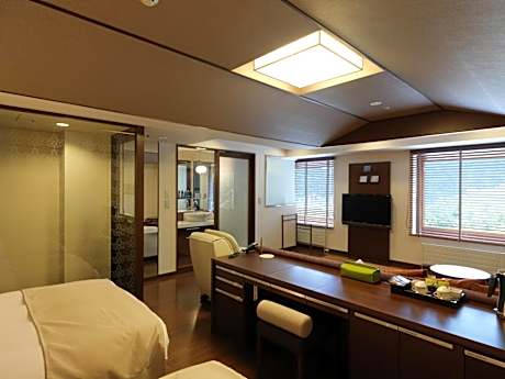 Offering free toiletries, this quadruple room includes a private bathroom with a shower, a bidet and a hairdryer. The spacious air-conditioned quadruple room offers a flat-screen TV, tatami, a tea and coffee maker, a seating area as well as mountain views. The unit has 2 beds and 2 futons.