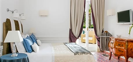 Air-conditioned room with hand-decorated Vietri tiles on the floors, classic furniture, and white walls.