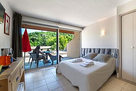 This room features a furnished terrace and a private bathroom fitted with a bathtub or a walk-in shower.