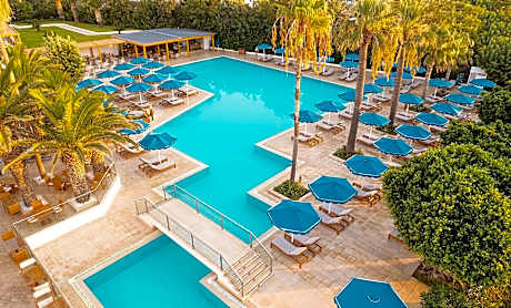 The all-inclusive Mitsis Faliraki is a 5-star hotel located just 33 feet from Faliraki Beach. It offers outdoor swimming pools, spa facilities and an animation team organizing events and parties. Guests have free access to the tennis court. Free WiFi is available throughout the property. The air-conditioned rooms are located in the three main buildings. Each has a mini-bar refilled every other day, satellite TV, and bathroom with hairdryer. Activities on site include billiards, aerobics classes, table tennis, beach soccer and more. Bicycles, horses and ponies are available for riding. A variety of water sports activities are available on the hotel beach. A multilingual animation team provides an exciting entertainment program throughout the day and night. Children will also enjoy the playground and kids' club. The main restaurant serves an early Continental breakfast, an American buffet breakfast, a complete buffet lunch and dinner and a late dinner buffet. Other dining options include Ellinadiko, Italian, Pan-Asian, Tex-Mex and pitta-burger à la carte restaurants. The Tex-Mex restaurant also has a brunch menu. Drinks, cocktails, and light snacks are served at the 3 available bars.