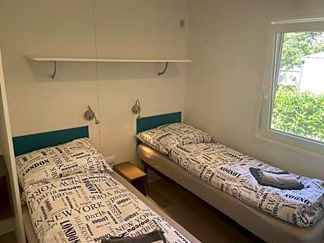 This air-conditioned mobile home is consisted of of 1 living room, 2 separate bedrooms and 2 bathrooms with a shower. The well-equipped kitchenette has a refrigerator, kitchenware, a microwave and an electric kettle. The mobile home features a terrace with outdoor furniture and garden views to relax in after a busy day. The unit offers 4 beds.