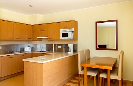Nestled within a magnificent green garden in a private condominium, this complex is ideally located a 15-minute walk from Vilamoura's marina and the beach, and less than 15 kilometers from Faro Airport. The hotel offers a range of facilities for a relaxing holiday, including a restaurant serving delicious dishes, a swimming pool area for both adults and children, a playground, and ample leisure spaces. Guests can also enjoy table tennis, a playing field, a pétanque court, and a multi-purpose playing field. The modern apartments are harmoniously arranged and surrounded by gardens, providing the perfect setting for an Algarve holiday. Each unit is fully equipped with all the necessary appliances and amenities for a comfortable stay for the whole family.