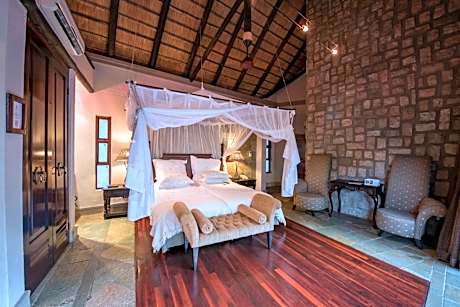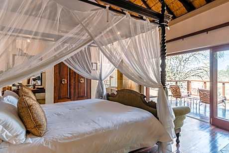 Shumbalala Game Lodge is located in the heart of the 14000-hectare Thornybush Game Reserve and lies adjacent to the Greater Kruger National Park. This African themed 5-star lodge features a swimming pool, sun terrace and a private viewing deck. Elegantly decorated in neutral and white shades, the beds are draped with a mosquito net and feature a modern combination of wooden and stone finished floors. The suite includes a cozy seating area and fireplace. Each suite has a mini-bar, tea-and-coffee-making facilities and a private viewing deck. Shumbalala Game Lodge's restaurant offers scrumptious dishes prepared by the in-house chefs. Dinners are hosted in the intimate and elegant dining room, as well as the uniquely designed cellar that offers views of the water hole. Shumbalala offers an African safari experience and features an array of wildlife ranging from lions, leopards, impalas, cheetahs and birds of prey. Hoedspruit’s Eastgate Airport is 16 mi away.