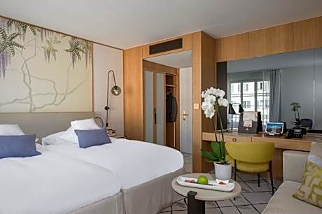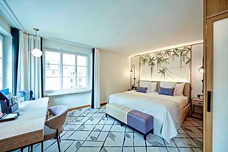 Renowned for warm hospitality for over 650 years, the Hotel Storchen enjoys a unique position in the heart of Zurich. It has its own boat pier directly at the Limmat River, and is within walking distance of all cultural attractions. The rooms and suites offer unique views of the river and of the picturesque Old Town. They combine classic furnishings with warm colors and modern facilities and feature high-speed wired and wireless internet access and air-conditioning. Swiss buffet breakfast can be enjoyed in the restaurant La Rôtisserie or, during the summer months, on the beautiful terrace overlooking the River Limmat and the Grossmünster Church. The Storchen bar features a cigar bar with a fine selection of cigars, and guests can also enjoy the trendy Barchetta Bar - Lounge - Piazza. THE NEST rooftop Bar offers a unique view over the rooftops of Zurich. The concierge team is available 24 hours a day. The hotel is a 10-minute walk from Zurich Main Station, and Zurich International Airport is only 9.3 mi or within a 30-minute drive away.