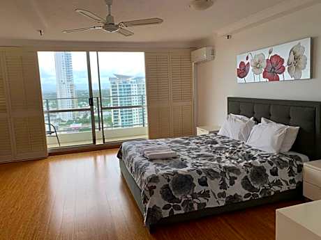 Located right on the beach in Surfers Paradise, The Penthouses offers spacious apartments with ocean views. Each has a fully equipped kitchen, 2 bathrooms and a private balcony overlooking the beach. Guests at The Penthouses Surfers Paradise Beachfront Apartments have access to a heated pool and spa pool. Facilities also include a full-size tennis court and a games room. Each apartment has a private laundry, 2 bathrooms, and dining and living areas with glass sliding doors that lead out to the private balcony. The full kitchen includes a microwave and dishwasher. Every apartment has 2 balconies, with at least one balcony overlooking the ocean. Many apartments have views of the Gold Coast hinterland. Free secure underground car parking is provided. Located halfway between Surfers Paradise and Broadbeach, The Penthouses Apartments are surrounded by world-class cafes and restaurants. Jupiters Hotel & Casino Gold Coast is 1.6 mi away.
