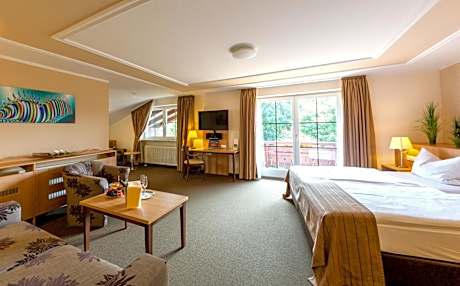 Providing free toiletries and bathrobes, this double room includes a private bathroom with a bath or a shower, a hairdryer and slippers. The double room features parquet floors, a seating area with a flat-screen TV with satellite channels, a mini-bar, a wardrobe, as well as a safe deposit box. The unit offers 1 bed.