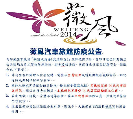 Wei Feng Motel Pingtung Branch provides flawless service and all the necessary facilities for visitors. Stay connected with your associates, as complimentary Wi-Fi is available during your entire visit. The motel offers taxi amenities to assist you in discovering your desired offerings in Pingtung. The motel offers reception assistance, including luggage storage, to ensure guest satisfaction. Whether you're here for an extended stay or simply require fresh garments, the motel ensures your cherished travel attire remains spotless and accessible with the convenience of laundromat located on the premises. The motel's daily housekeeping ensures an excellent option for your stay.To ensure the well-being and convenience of all visitors, smoking is strictly prohibited throughout the entire motel.In order to ensure the utmost level of relaxation, the guestrooms feature an inviting design and are equipped with all basic necessities, creating a delightful stay experience.To ensure a pleasant stay, a selection of rooms at motel come furnished with linen service, blackout curtains and air conditioning, all designed with your ease in mind.In select rooms, visitors can enjoy a touch of amusement with the availability of daily newspaper, television, in-room video streaming and cable TV for their entertainment needs.Within specific rooms, a refrigerator, bottled water, instant coffee, instant tea and mini bar is conveniently available for your use. Wei Feng Motel Pingtung Branch offers a hair dryer, toiletries and bathrobes in the restrooms of specific accommodations. Each day, arise to a delightful complimentary morning meal at Wei Feng Motel Pingtung Branch.Various excellent meal offerings at motel ensure that enticing and easily accessible options are constantly available. Upon your arrival, don't miss experiencing karaoke rooms for enjoyable in-house evening entertainment. Wei Feng Motel Pingtung Branch provides a superb assortment of leisure amenities for guests to enjoy.Unwind and conclude each day delightfully by stopping by massage, hot tub, steam room and spa, ensuring a soothing experience.