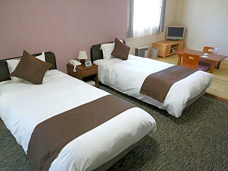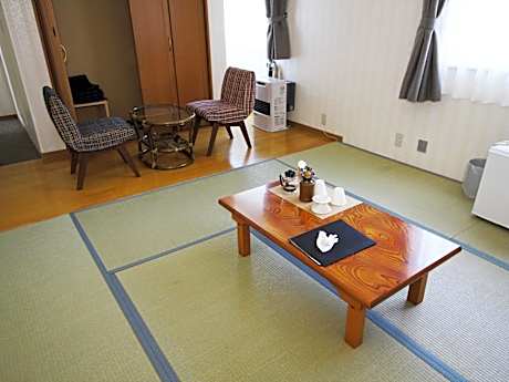 Air-conditioned room fitted with an extra large bed, an LCD TV and a fridge. It features a Japanese-style seating area with a tatami (woven-straw) floor.