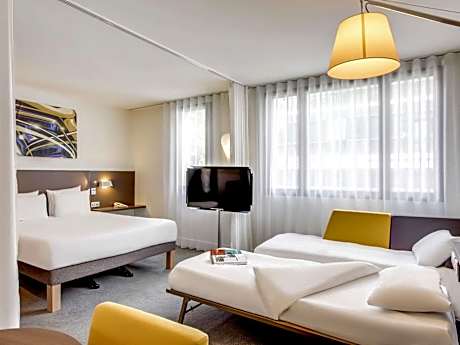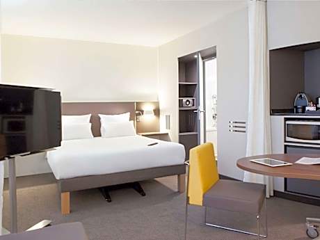 "The Novotel Suites Paris Stade de France is located at the foot of the Stade de France, 1.9 mi from the center of Paris. The hotel is directly accessible by public transport from Charles de Gaulle airport, Gare du Nord and the Villepinte exhibition center. Guests have free access to the 24-hour gym. With an area of 98 ft², the suites of this hotel are designed to guarantee your comfort and well-being. They include air conditioning, a private bathroom with shower and bathtub, a Nespresso coffee machine and a microwave. You will also enjoy a high-speed internet connection. The bar is open 7 days a week in a warm and friendly space. Breakfast every day from 6 a.m. to 11 a.m. offers a choice of sweet and savory products, pastries, hot drinks, fruit juices. The Boutique Gourmande, open 24 hours a day, 7 days a week, offers a choice of starters, dessert dishes and drinks. Finally, the hotel offers an ironing room.