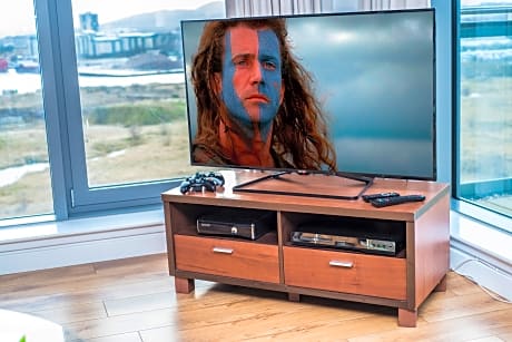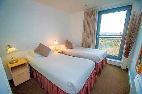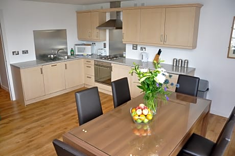 These stylish apartments are in Edinburgh, with views of the Firth of Forth and easy access by bus to Edinburgh city center. There is free parking, Wi-Fi and a DVD library. Ocean Serviced Apartments form part of Edinburgh's regenerated harbor area. The Royal Yacht Britannia and the shops, cinemas and restaurants of the Ocean Terminal complex are close by. The bustling city center with the famous Edinburgh Castle is a 15-minute drive away. Each apartment has 2 spacious bedrooms and 2 tiled bathrooms. The large living rooms have digital TVs, DVD players and comfortable sofas. Some rooms also have views of the bay, and facilities and services can be tailored to your needs. The fully equipped kitchens have ovens, fridges, dishwashers and washing machines. They open on to a dining area with a table and chairs for guests. Apartments are serviced and fresh linen and towels are provided once a week.