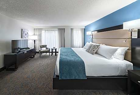 This room has a balcony. Amenities include a flat-screen TV with cable channels, a Keurig coffee maker and deluxe bath amenities.