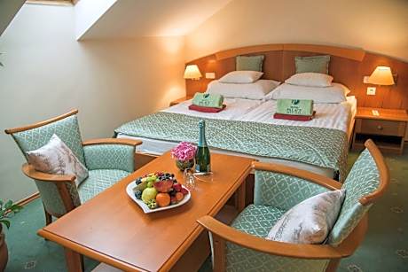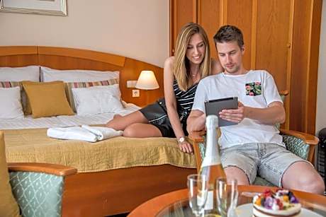The 4-star Palace Hotel Hévíz is located in the pedestrian zone of Heviz, 1640 feet from the Thermal Lake, renowned for its magnificent, curative water. It offers free wellness as well as free WiFi for its guests. Enjoy contemporary international and Hungarian cuisine, expert wellness and medical treatments and make use of the wide range of spa facilities. Guests arriving with children can make use of the children's corner. Buffet breakfast is included in the room rate.